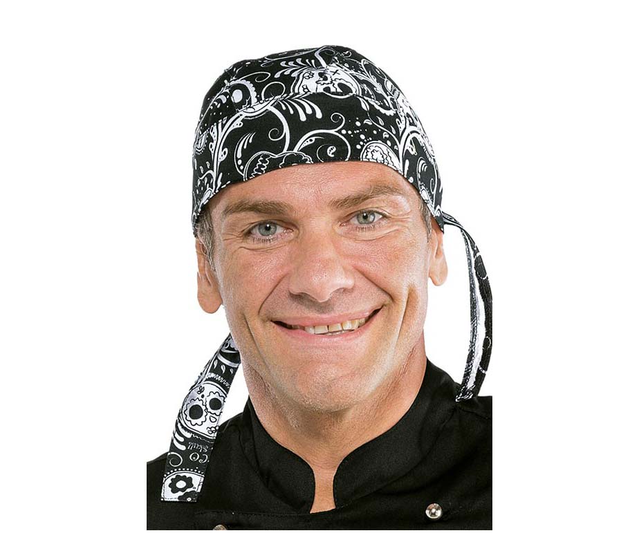 Bandana gorra cocinero original y moderna. Pack de 2 bandanas de cocina en negro con estampado calaveras. Gran calidad. Gorros piratas ideales para uniformes de cocina personalizados. Se vende en pack de 2 unidades, por lo que el precio es por pack 2 bandanas.