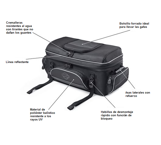 - Las correas estilo MOLLE para una fácil fijación de la bolsa y el fondo antideslizante resistente a la abrasión hacen que la bolsa se mantenga en su lugar. Una línea reflectante proporciona visibilidad a otros conductores.