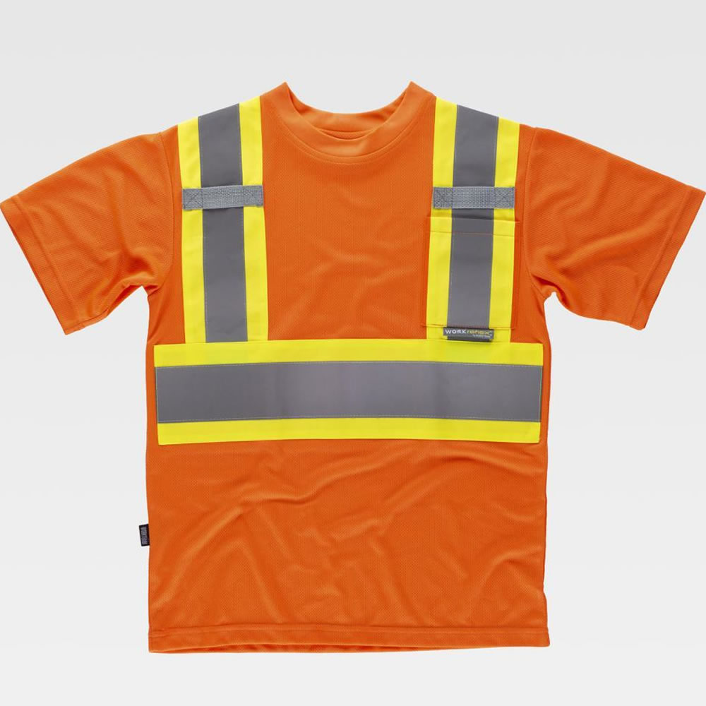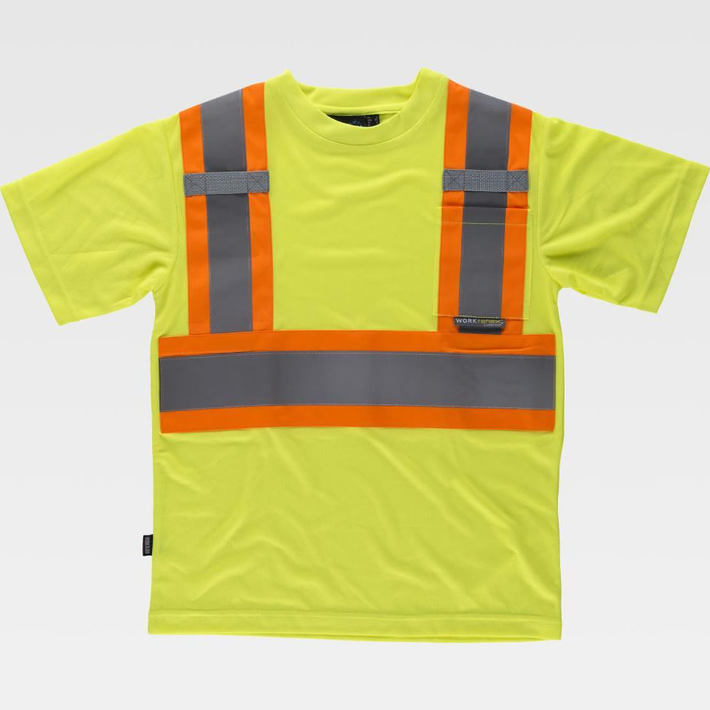 Camiseta reflectante-fluorescente de manga corta en poliéster ojo de perdiz. Cuello redondo en punto canalé con cubrecosturas interior. Trabillas de cinta tejida gris y un bolso de plastón en el pecho. Una banda fluorescente con una cinta reflectante en pecho, espalda y hombros. Tejido fresco y ligero de alta permeabilidad al aire. Transpirable, de fácil secado y resistente al encogimiento.