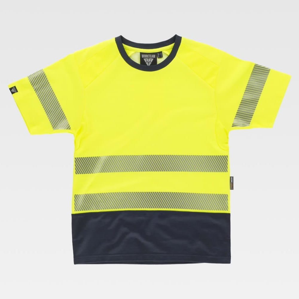 Camiseta combinada de manga corta en micropiqué de poliéster con interior de algodón. Parte superior de alta visibilidad. Reflectantes segmentadas y tejido de rejilla para regular la transpiración. Cuello redondo con cubrecosturas interior. Una reflectante segmentada termoadhesiva en mangas y dos en pecho y espalda.