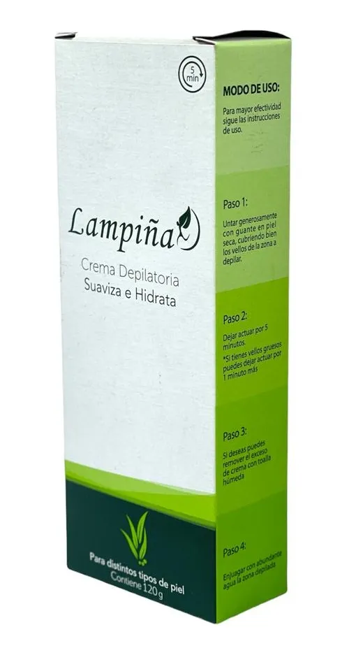 La crema depilatoria Lampiña viene en un tubo de 120 g, con un diseño cómodo de manejar. Sus medidas son 16 cm de largo por 6 cm de ancho, con un peso total de 145.2 g, lo que la hace práctica y fácil de almacenar.