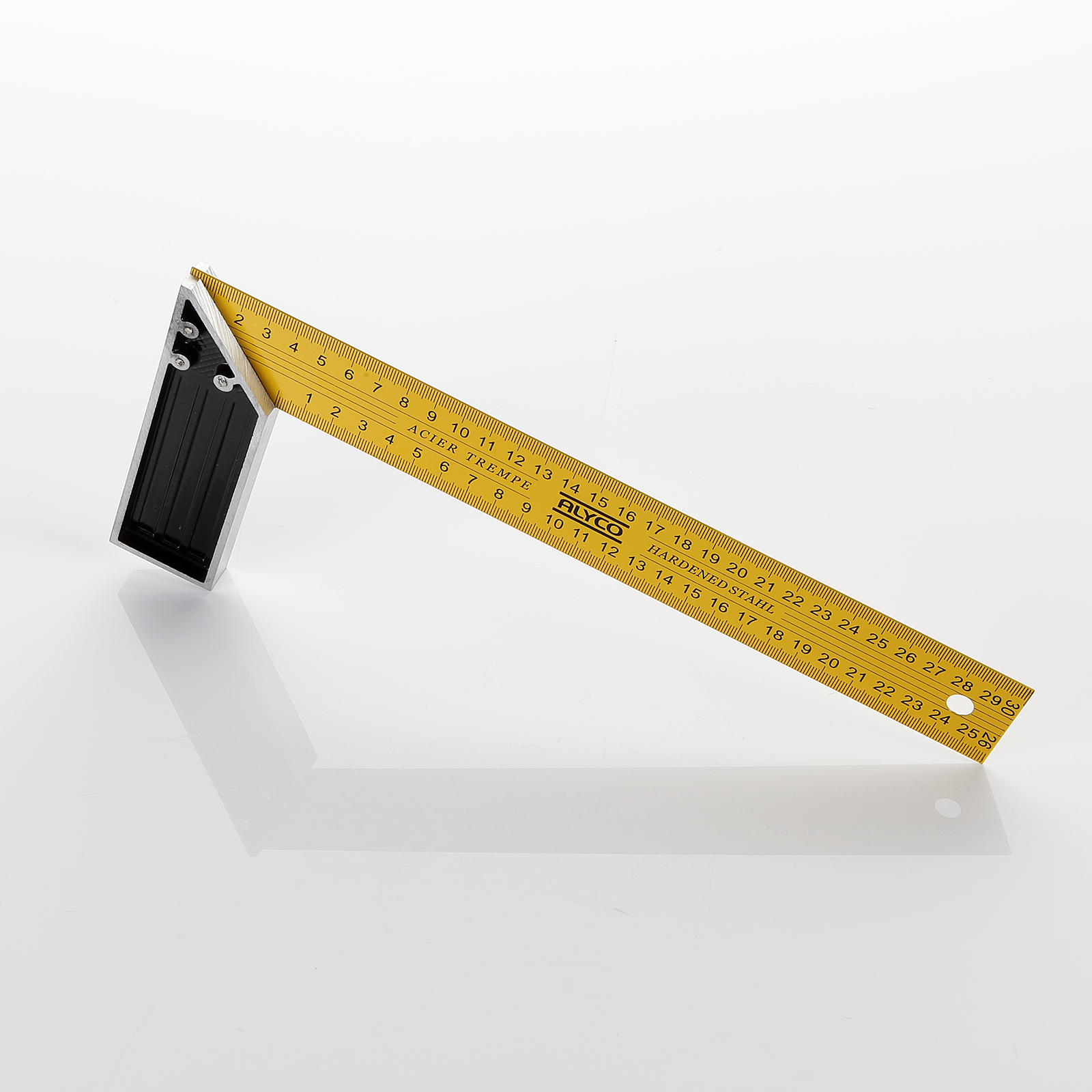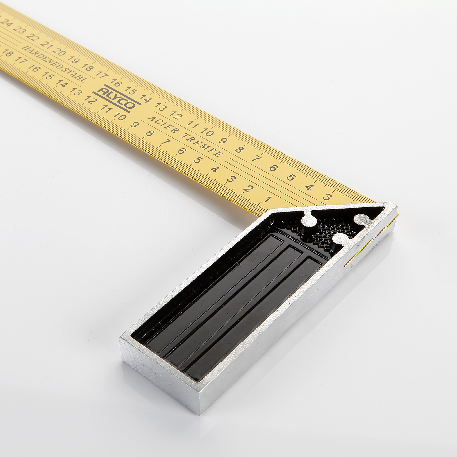 La hoja de esta escuadra está realizada sobre acero templado y se ha marcado en mm por ambos lados. La escala está diseñada para una fácil lectura.