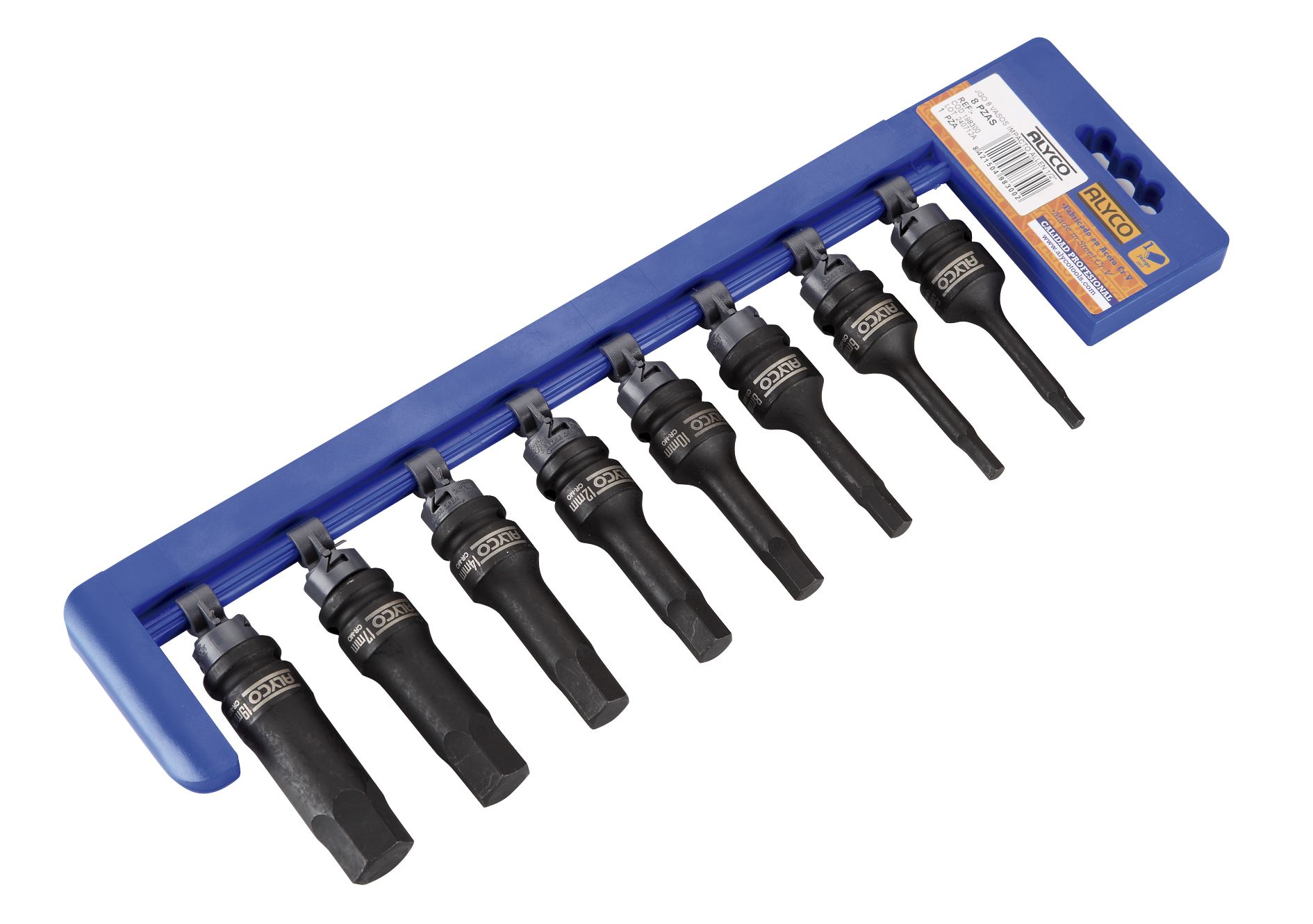 Juego de 8 llaves de vasos de impacto con punta allen y cuadradillo 1/2″. Incluye puntas de diferentes medidas para poder afrontar un amplio número de tareas: 5, 6, 8, 10, 12, 14, 17 y 19 mm. Se trata de llaves especialmente largas, diseñadas para poder contar con un rango de acción más amplio y trabajar a mayor distancia.
