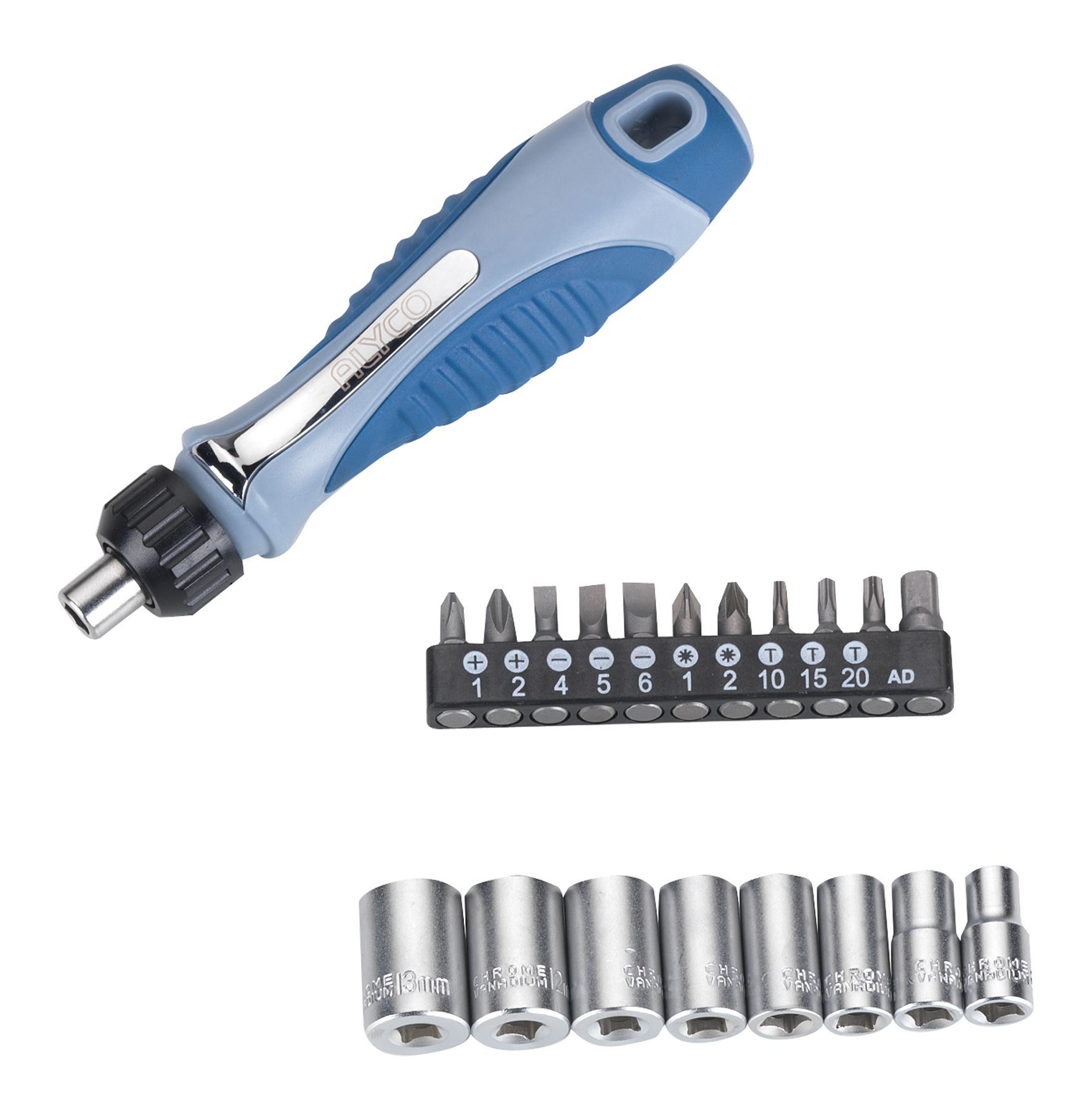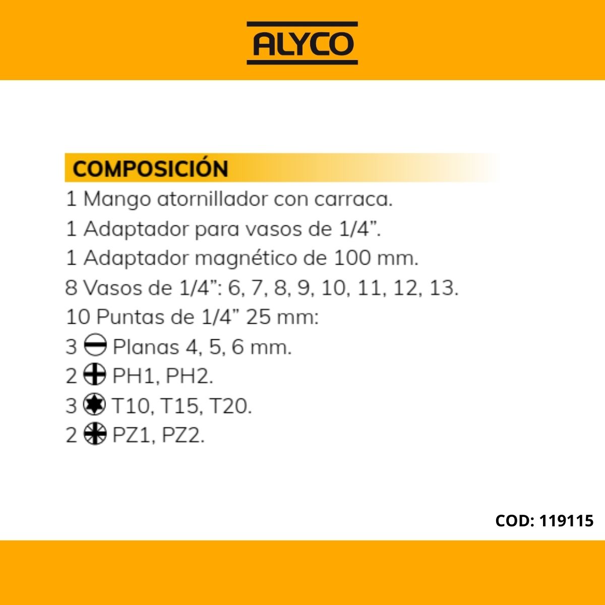 En concreto, este kit cuenta con: 1 mango bimaterial con empuñadura ergonómica, que permite trabajos más cómodos y reduce el cansancio de la mano; 1 Adaptador para vasos de 1/4″; 1 Adaptador magnético de 100 mm; 8 vasos (1/4″: 6,7,8,9,10,11,12,13 mm) y 10 puntas de boca recta (4,5,6 mm), torx (T10,T15,T20), Phillips (PH1,PH2) y pozidriv (PZ1,PZ2).