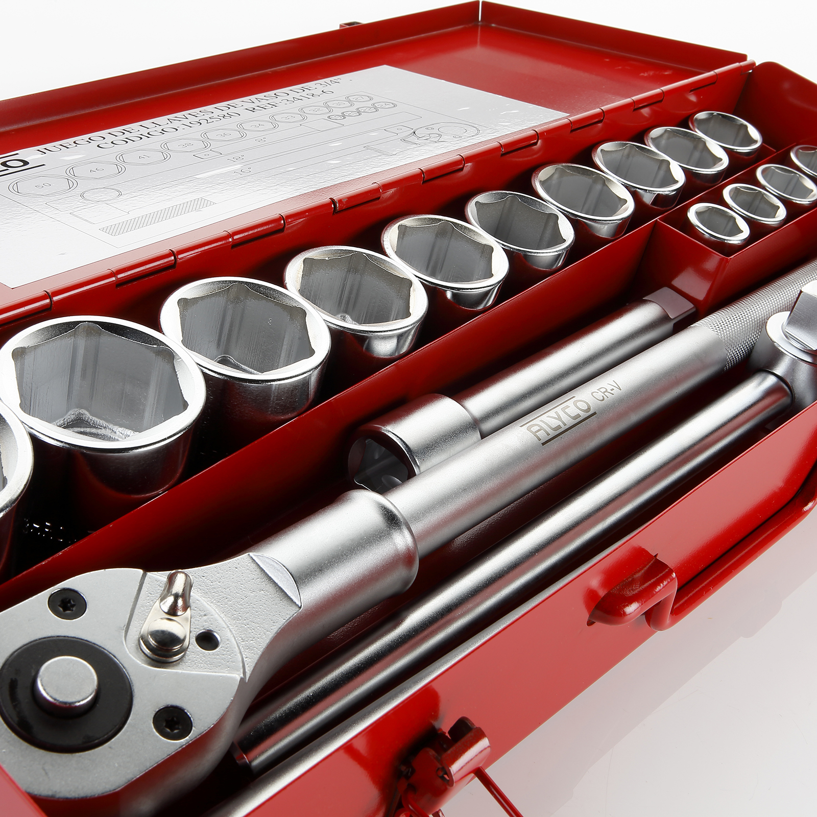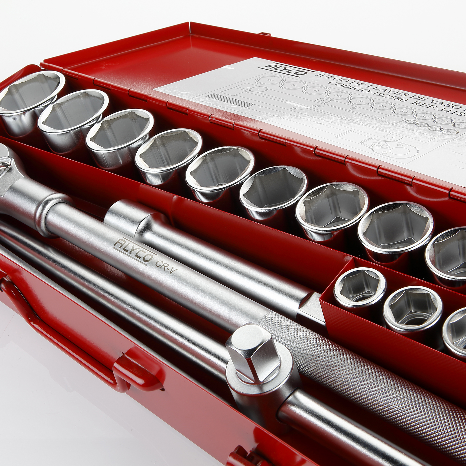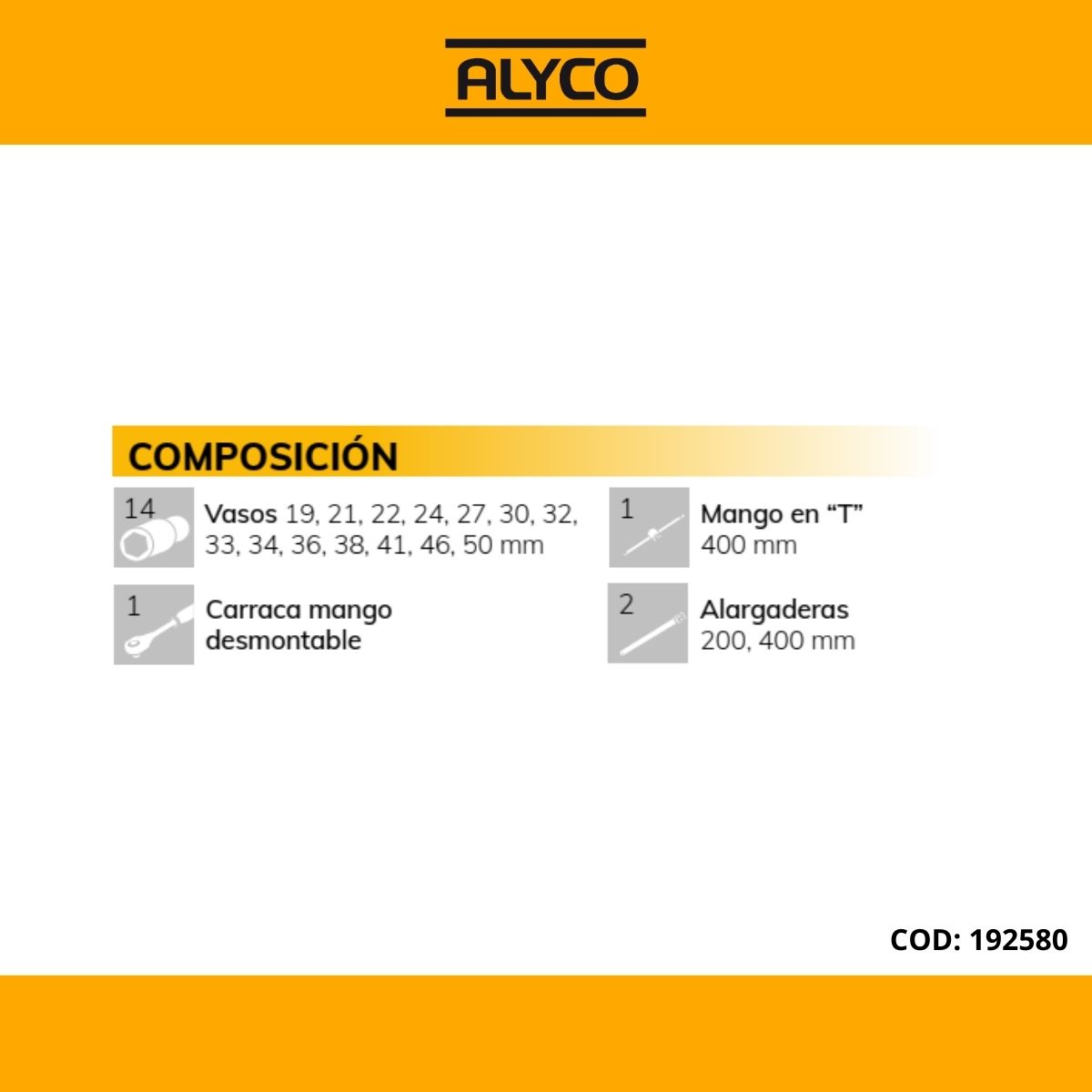 -Composición: 14 vasos (19 a 50 mm) / 1 carraca desmontable con inversor y expulsor de vasos de 24 dientes / 2 alargaderas (200, 400 mm) / 1 mango en T de 400 mm.