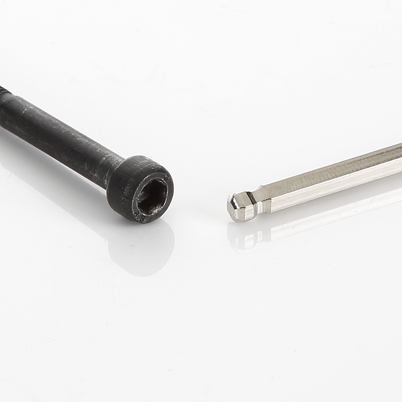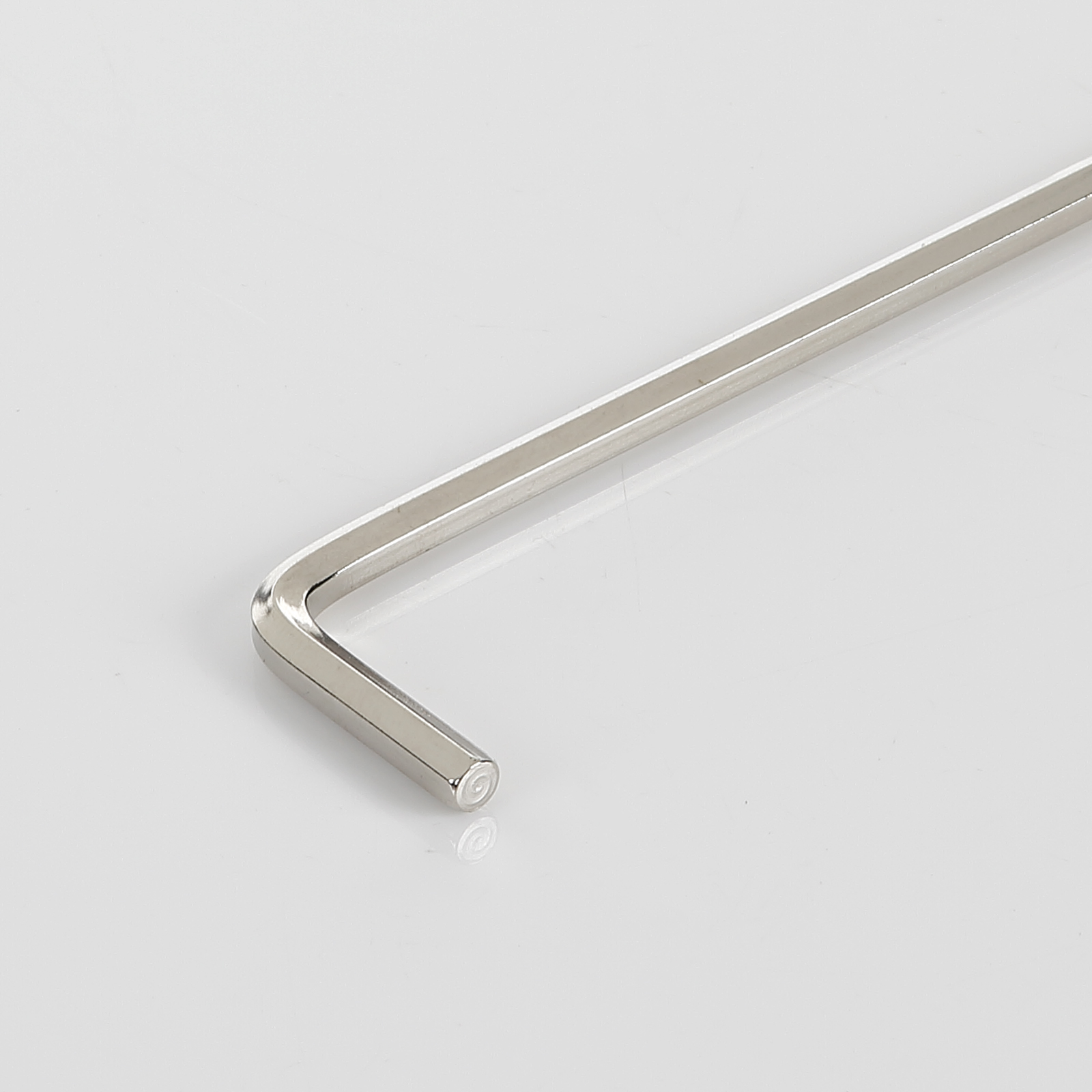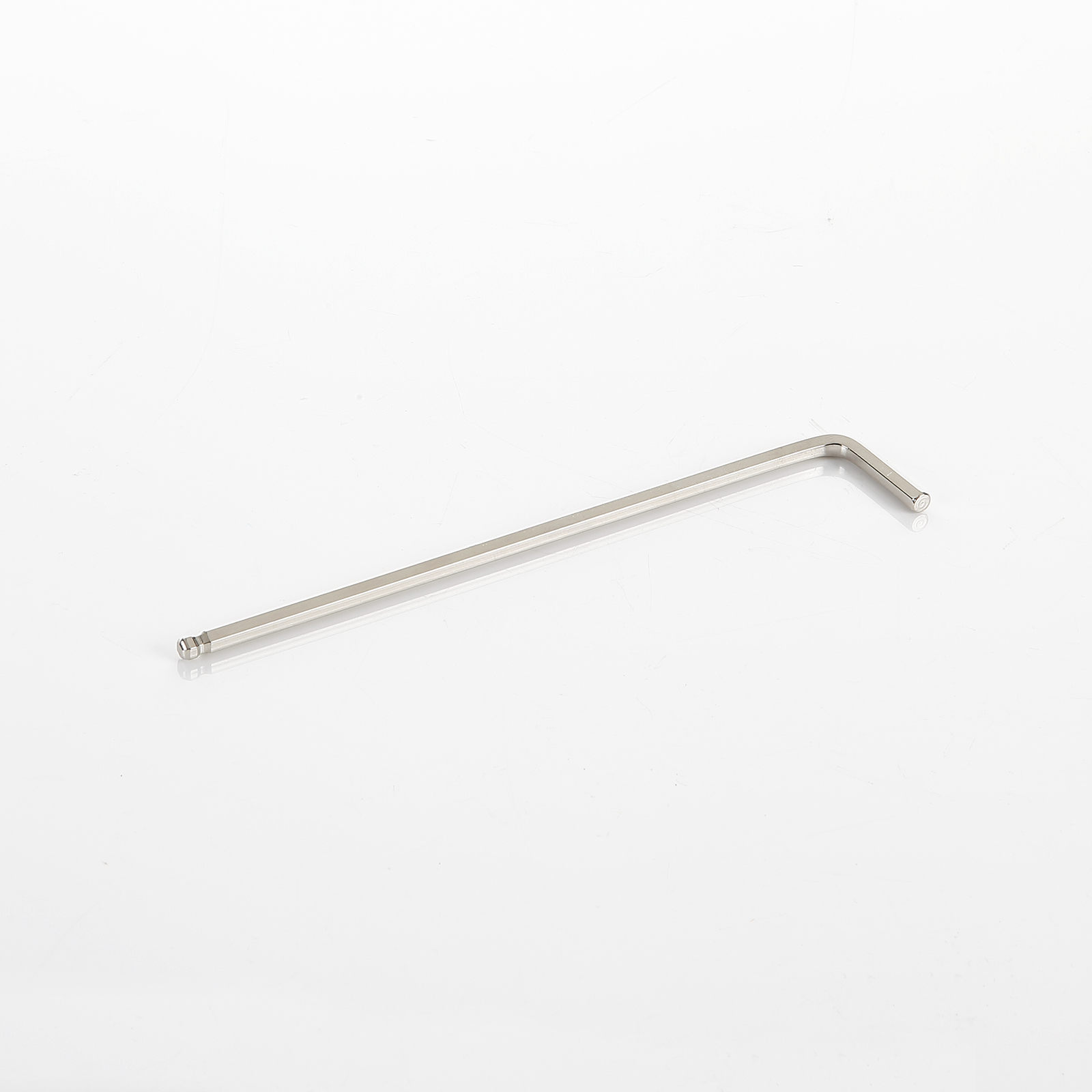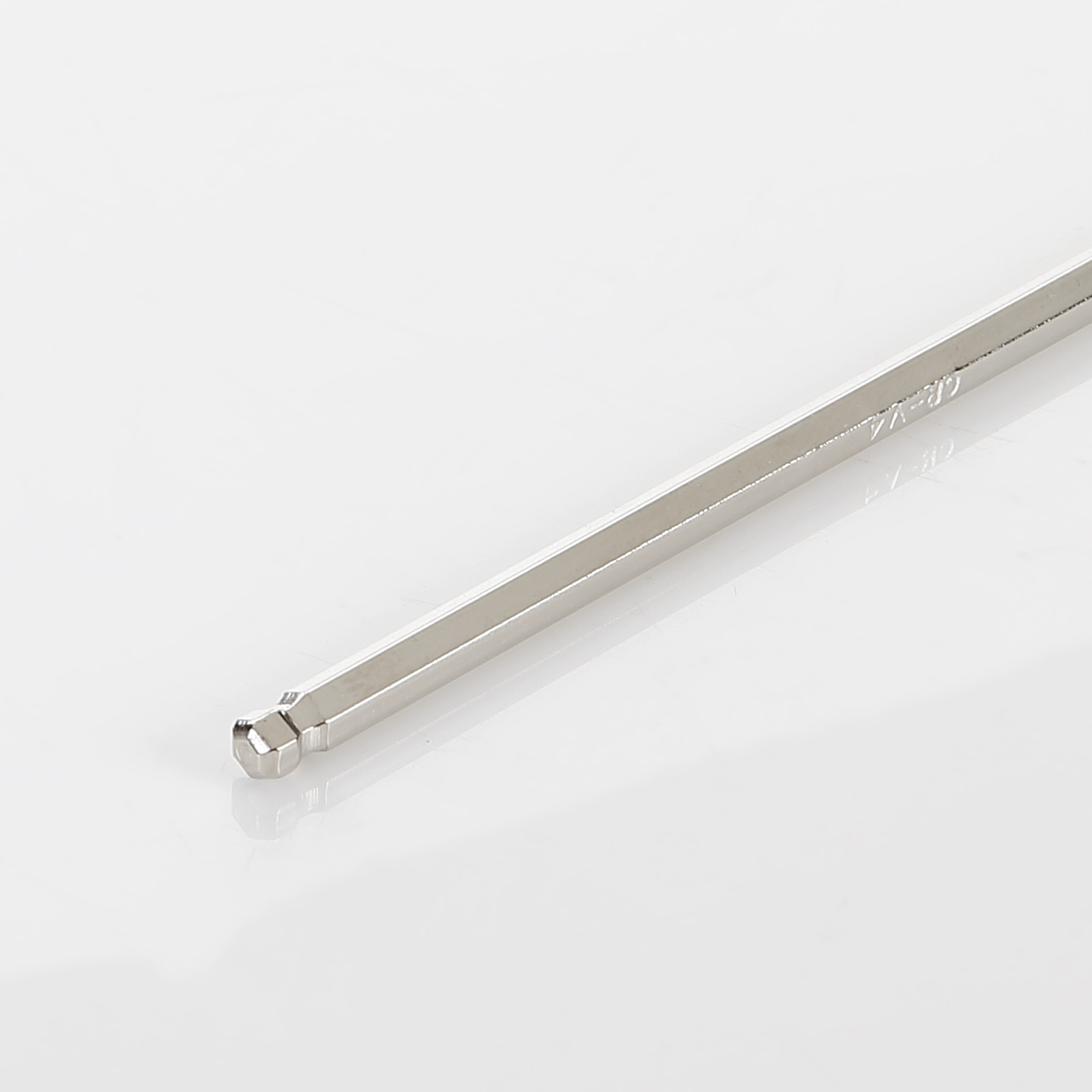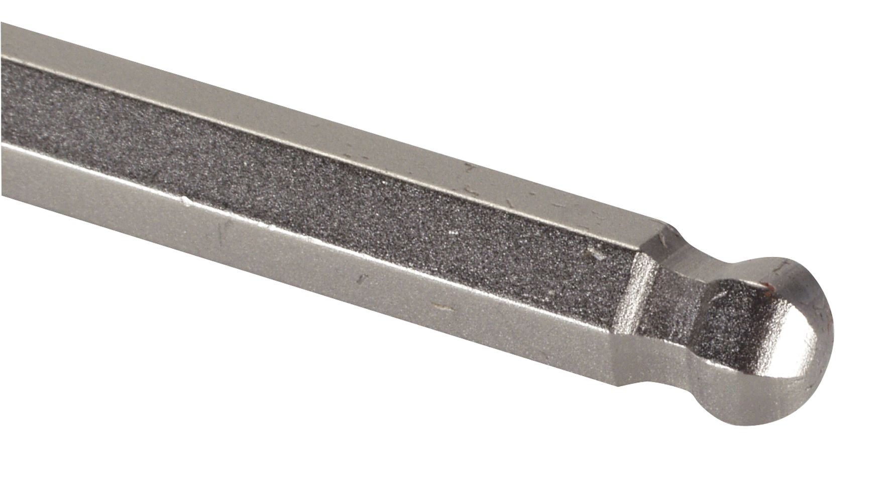 Llave acodada hexagonal allen con punta de bola en angulo de 90 grados fabricada en Acero al Cromo Vanadio, endurecida mediante tratamiento térmico, con extremos imantados. Medida extralarga en milímetros. El perfil hexagonal achaflanado de las puntas consigue mayor facilidad de entrada en el orificio y mayor superficie de contacto con la pieza, mejorando la transmisión del esfuerzo.