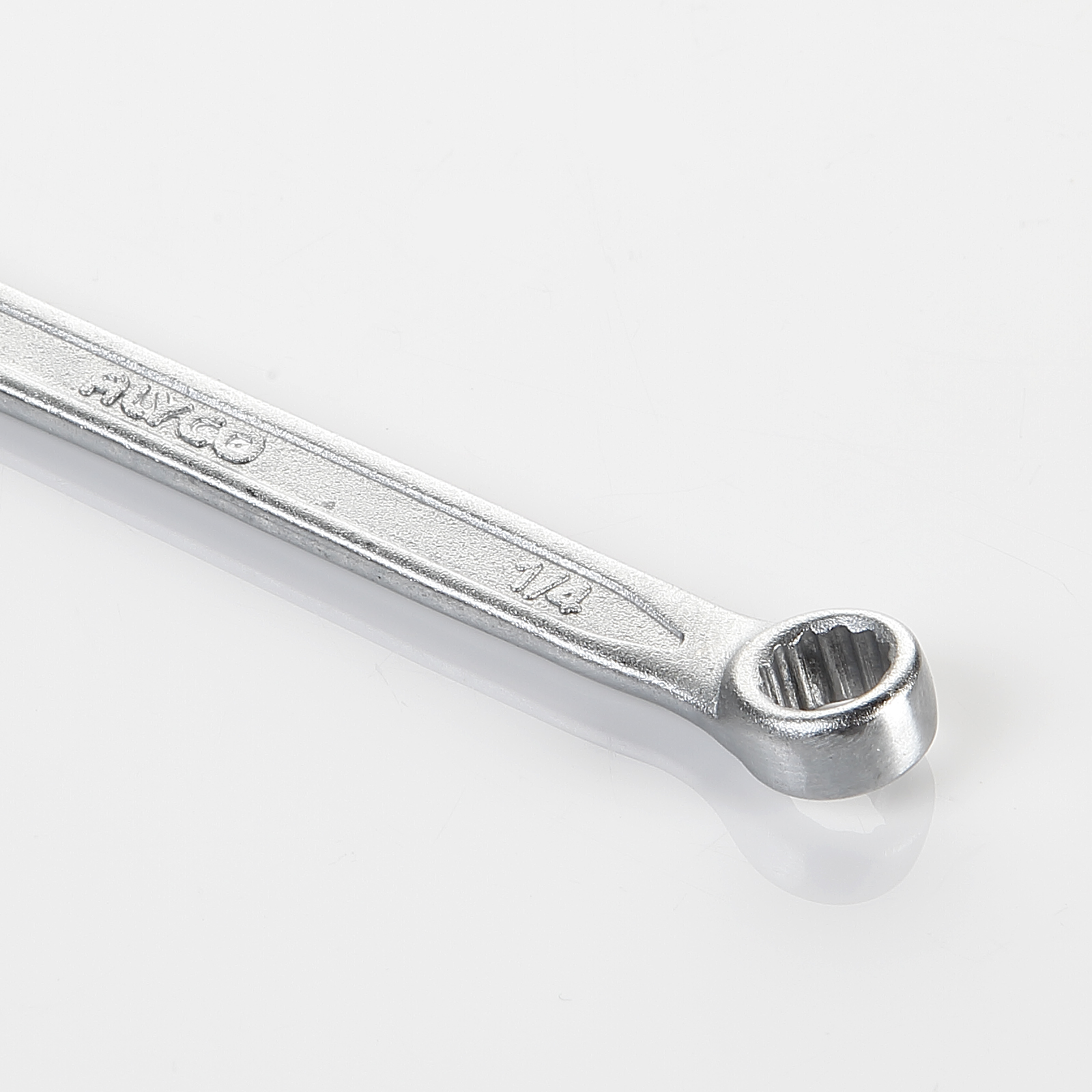 Llave de dos bocas una abierta y otra de estrella con aristas redondeadas, fabricada en Acero al Cromo- Vanadio, forjada de una sola pieza, endurecida por tratamiento térmico, y con tratamiento superficial de cromado para evitar la oxidación.