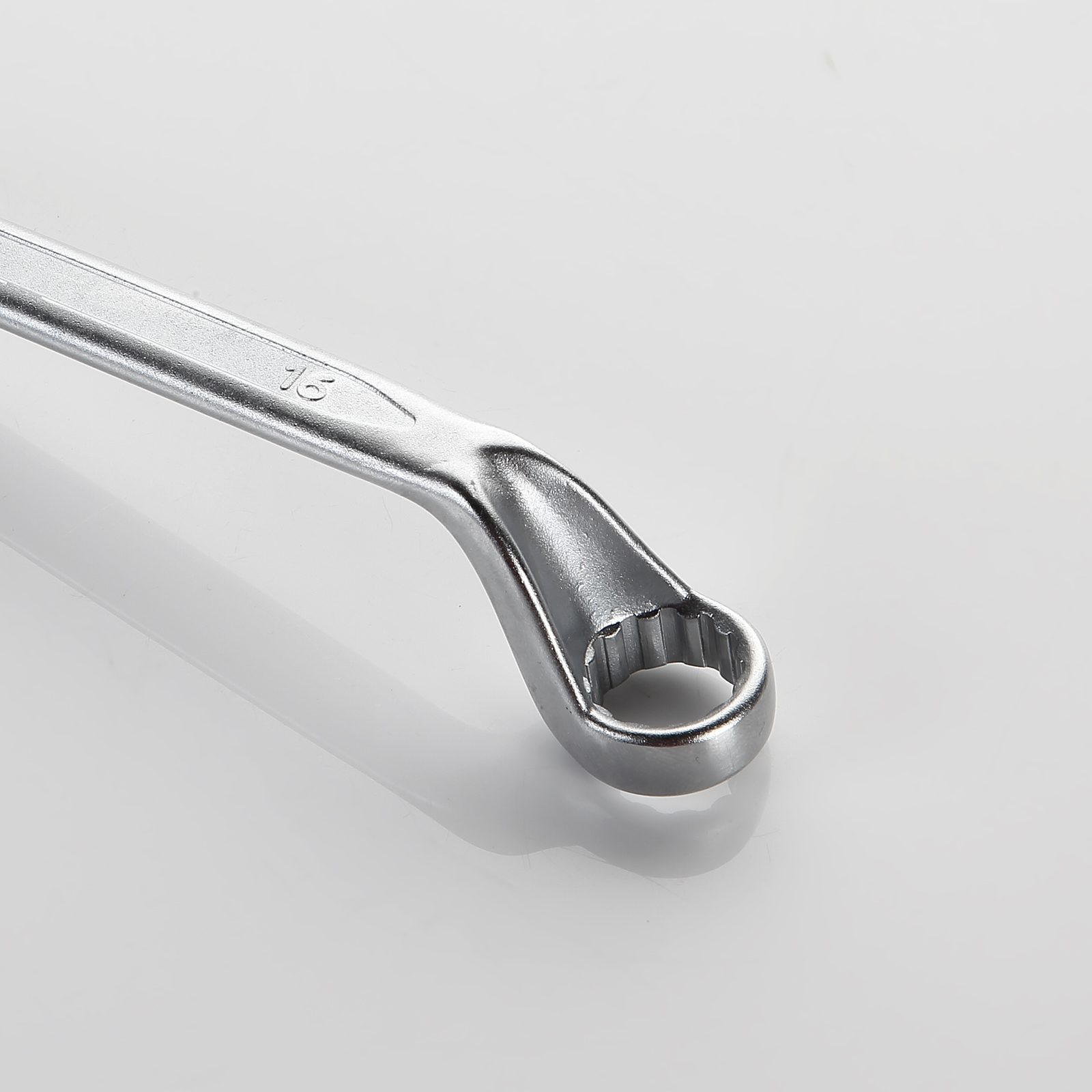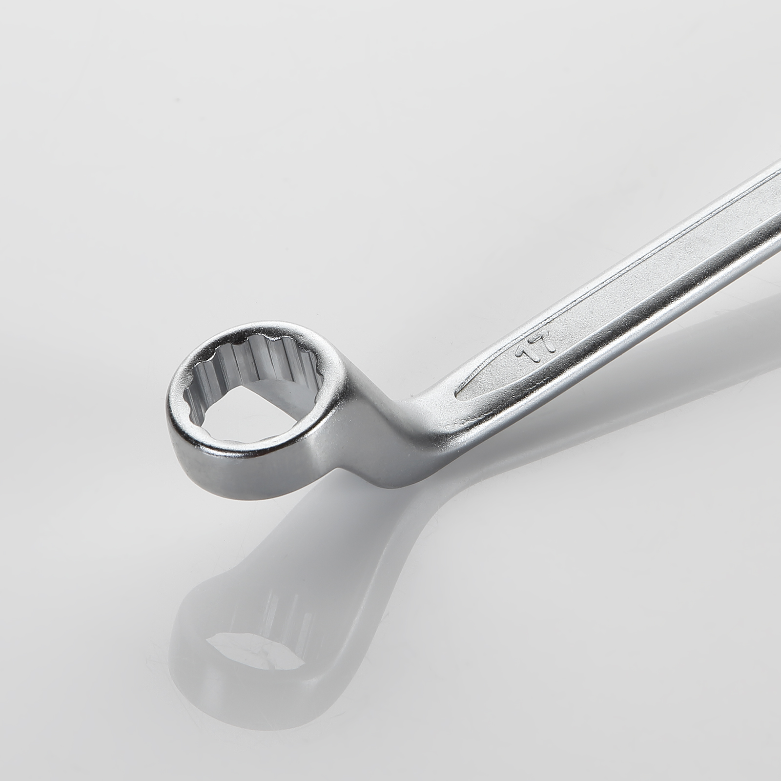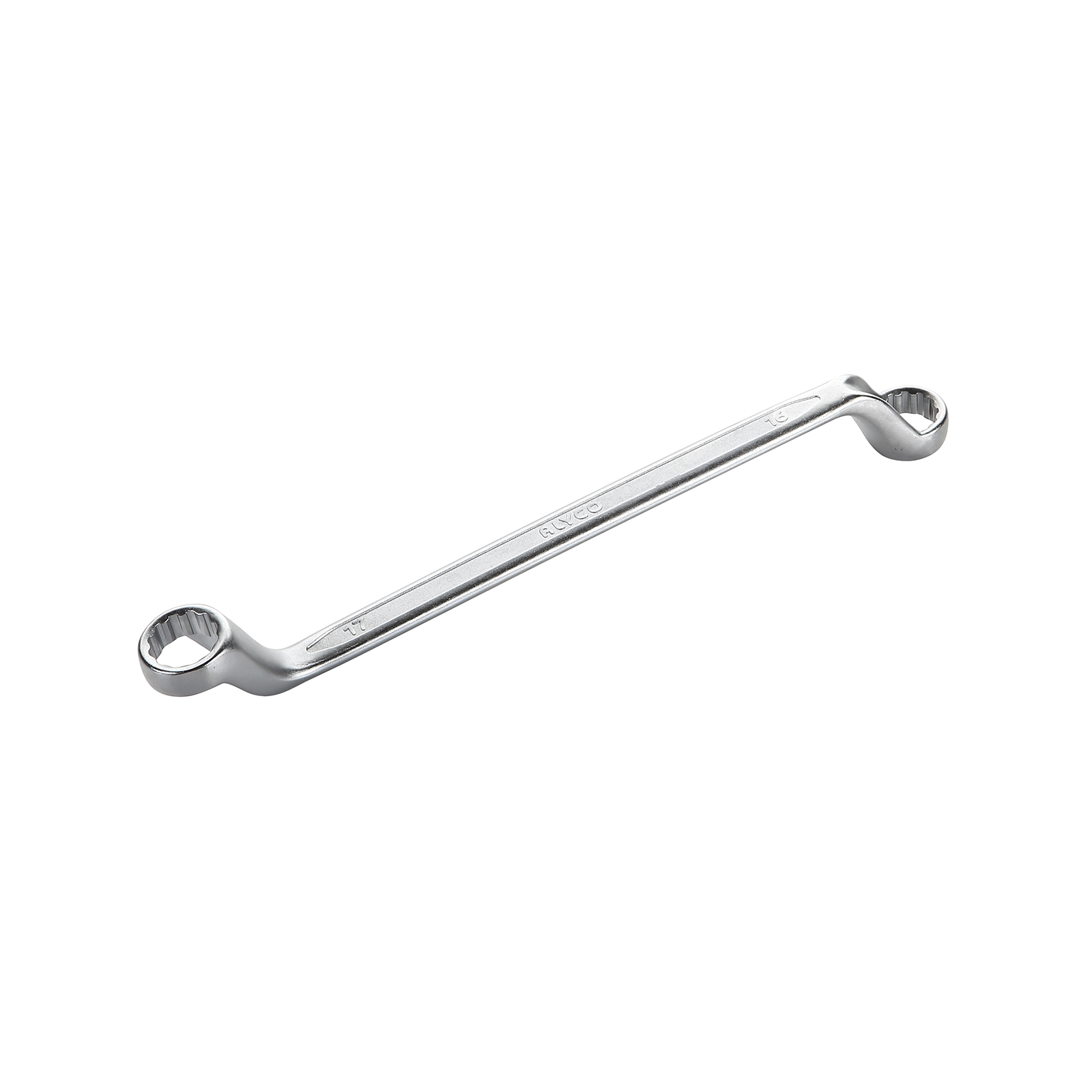 Llave de dos bocas estrella con acodado de 75º. Las bocas de estrella tienen las aristas redondeadas. Fabricada en Acero al Cromo- Vanadio, forjada de una sola pieza, endurecida por tratamiento térmico, y con tratamiento superficial de cromado para evitar la oxidación.