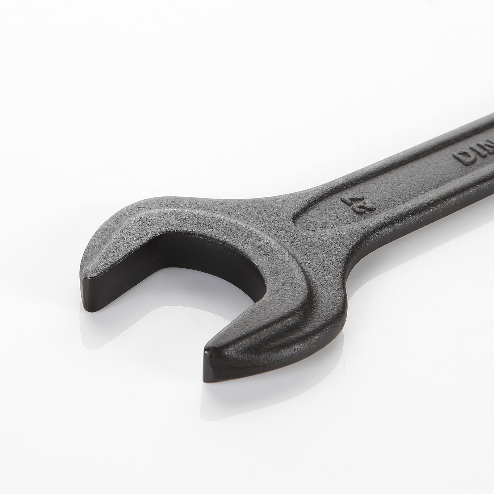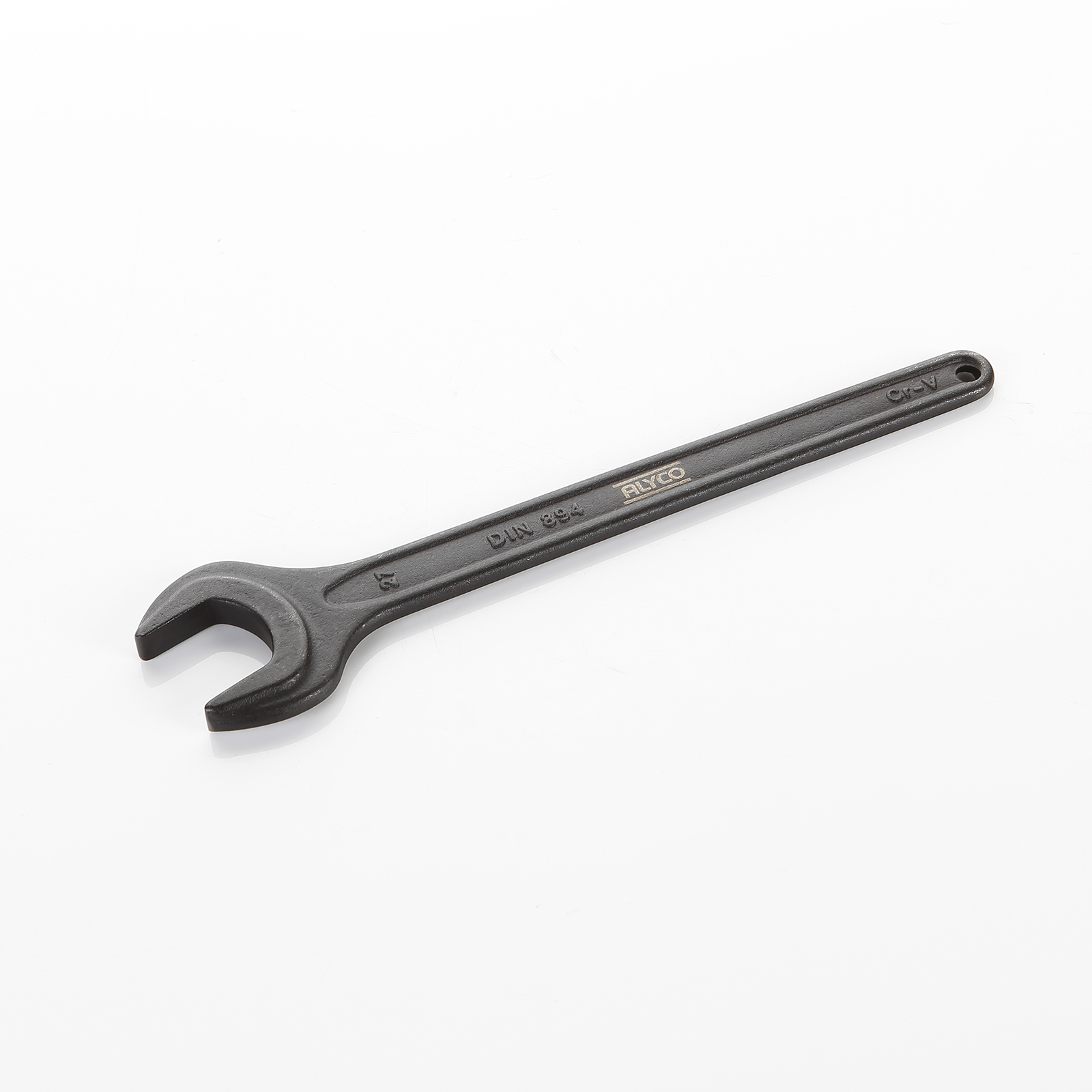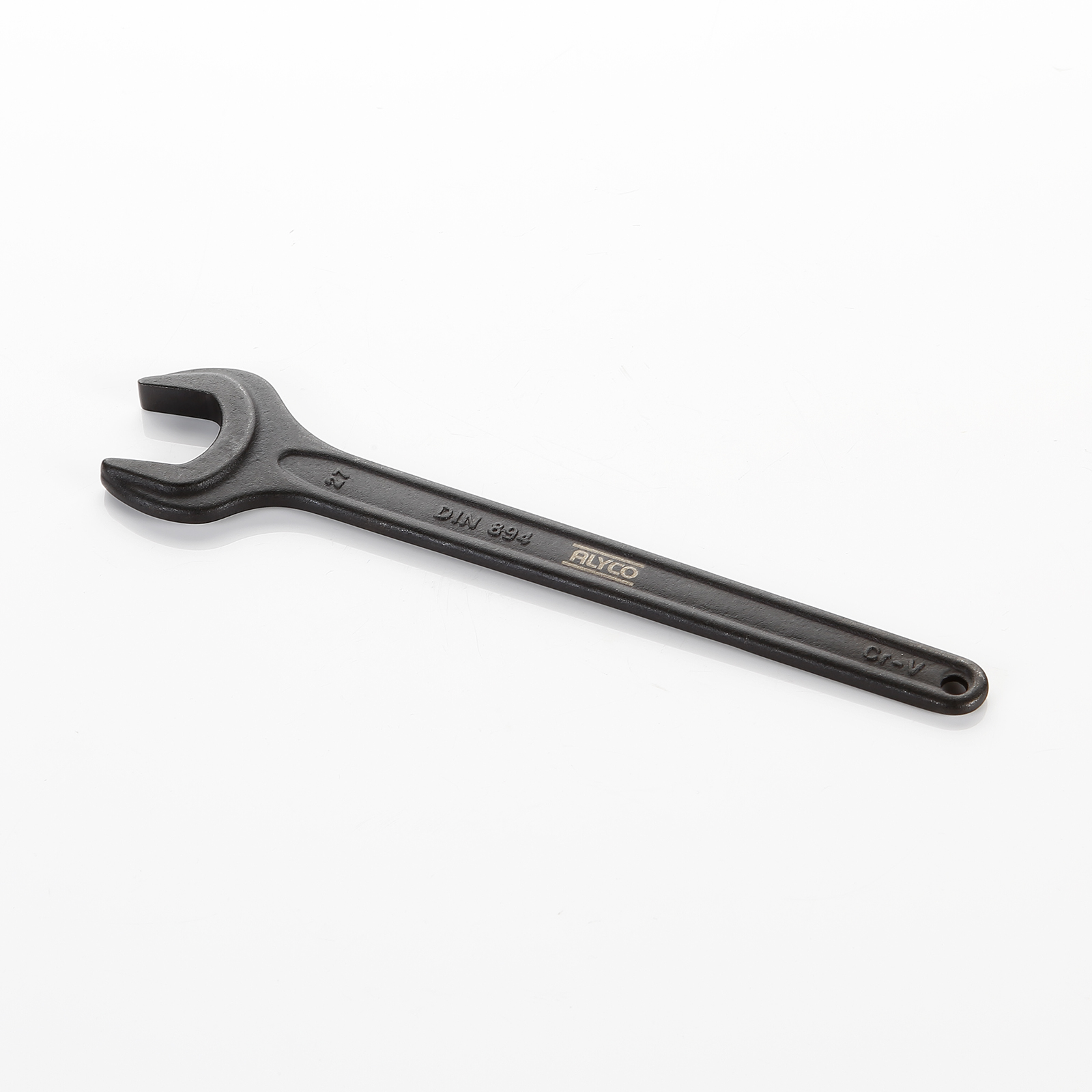 Llave fija de una boca, fabricada en Acero al Cromo-Vanadio, forjada de una sola pieza, endurecida por tratamiento térmico, y con tratamiento superficial de pavonado para evitar la oxidación. Los procesos de fabricación hacen que la llave tenga una capacidad de apriete superior a la norma DIN 894, una elasticidad que evita la rotura durante su uso, haciéndola mucho más segura, y una larga vida debido al tratamiento térmico y al tratamiento superficial.