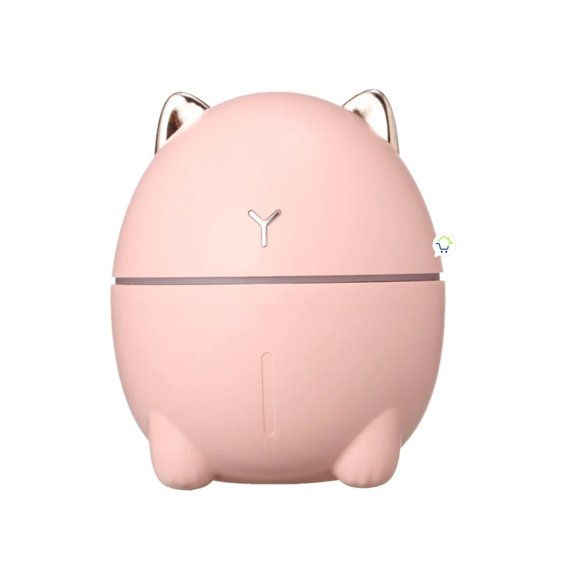 Es un humidificador portátil de pequeño tamaño con forma de esfera y orejas de gato. El humidificador tiene luz LED y funciona con un cable USB, lo que lo hace ideal para usar en cualquier lugar.