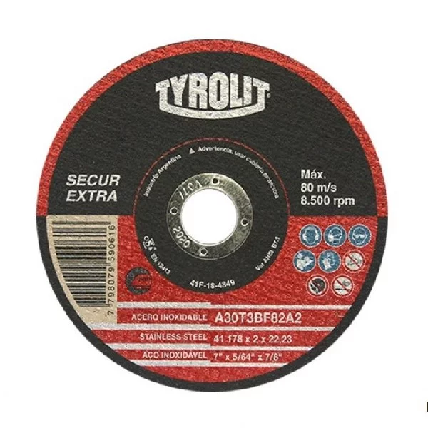 • Discos Abrasivos TYROLIT SECUR EXTRA Inox: Alta capacidad de corte y larga vida útil, especialmente recomendados para aceros inoxidables.